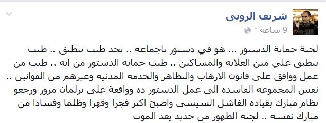 وقال “الروسي”، عبر منشور له على “فيس بوك”: “لجنة حماية الدستور … هو في دستور ياجماعة .. بجد طيب بيطبق .. طيب بيطبق علي مين الغلابة والمساكين .. طيب حماية الدستور من ايه .. طيب من عمل ووافق على قانون الإرهاب والتظاهر والخدمة المدنية وغيرهم من القوانين”.