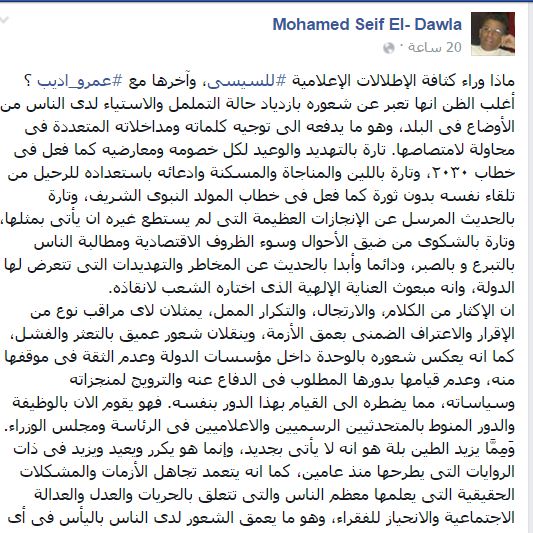 واختتم “سيف الدولة” منشوره قائلا: “وأخيرا فانه حين يتكلم متقمصا شخصية الرجل الطيب، يتناسى ما ترتكبه كل يوم أذرعه الإعلامية من شيطنة للمعارضين، وأجهزته الأمنية من اعتداء ومطاردة وترهيب، وقراراته وماكيناته الاقتصادية من وقف حال وإفقار للجميع”.