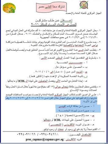 أعلن الجهاز المركزي للتعبئة العامة والإحصاء، اليوم الأربعاء، عن حاجته لـ40 ألف شاب من الجنسين للعمل “جامعي بيانات” عـن السكان والإسكان والمنشآت، خلال الفترة من 20 أغسطس 2016 وحتى 9 فبراير 2017 بجميع محافظات الجمهورية.