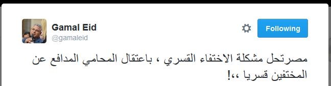 وقال عيد فى تغريدته: “إن مصر توصلت إلى حل مشكلة المختفين قسريًا، بالقبض على المحامين المدافعين عنهم”.