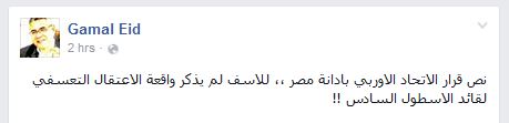 سخر الناشط السياسي جمال عيد من تدهور سمعة مصر الخارجية عقب إصدار الاتحاد الأوروبي بيانا يدين مصر لمقتل الطالب الإيطالي “ريجيني”.