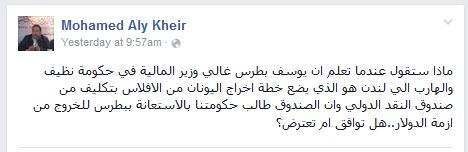 نشر الصحفي محمد علي خير، تعليقا أكدد فيه أن صندوق النقد الدولي طلب من مصر الاستعانة بوزير ماليتها الأسبق الهارب بطرس غالي للخروج من أزمة الدولار، وذلك من خلال صفحته الشخصية بموقع التواصل الاجتماعي “فيس بوك”.