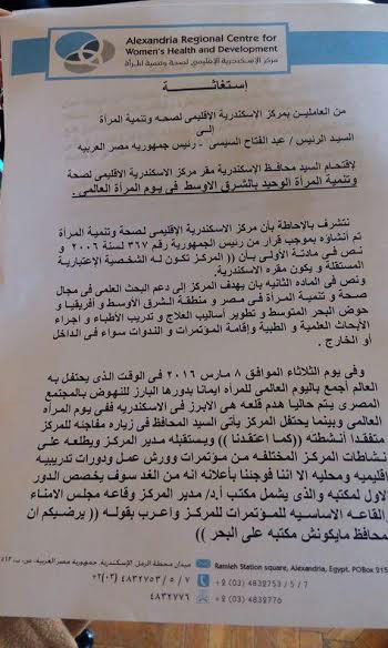 وجَّه المركز الإقليمي لصحة المرأة، خطاب استغاثة لعبدالفتاح السيسي؛ بشأن تهديدات المهندس محمد عبدالظاهر، محافظ الإسكندرية، ورغبته في الحصول على مبنى المركز بمنطقة محطة الرمل، ما يهدد نشاطه الخاص بصحة المرأة.