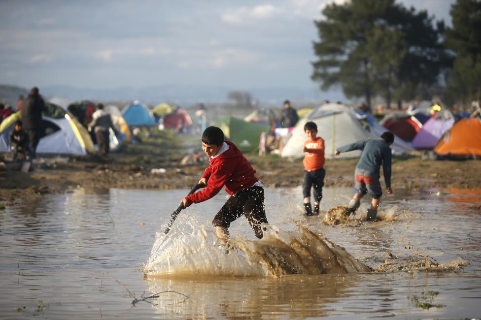 1- طفل من اللاجئين يلهو بالمياه التي غمرت المخيم الذي يعيش فيه بالقرب من الحدود اليونانية-المقدونية.