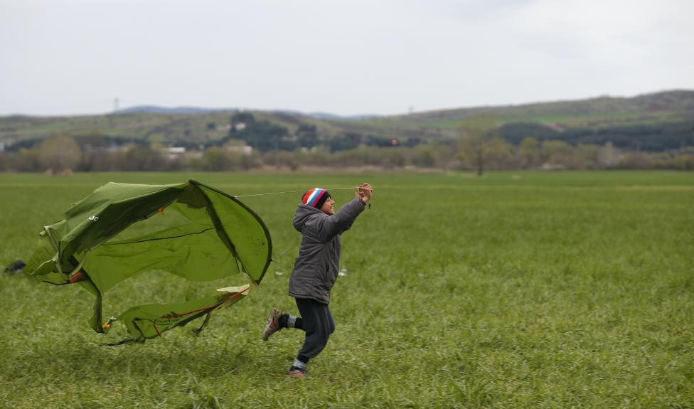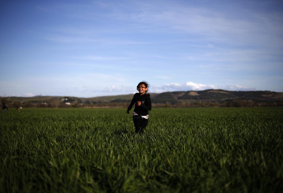 5- فتاة تجري عبر الحقول، في مخيم مؤقت للمهاجرين بالقرب من الحدود اليونانية-المقدونية.