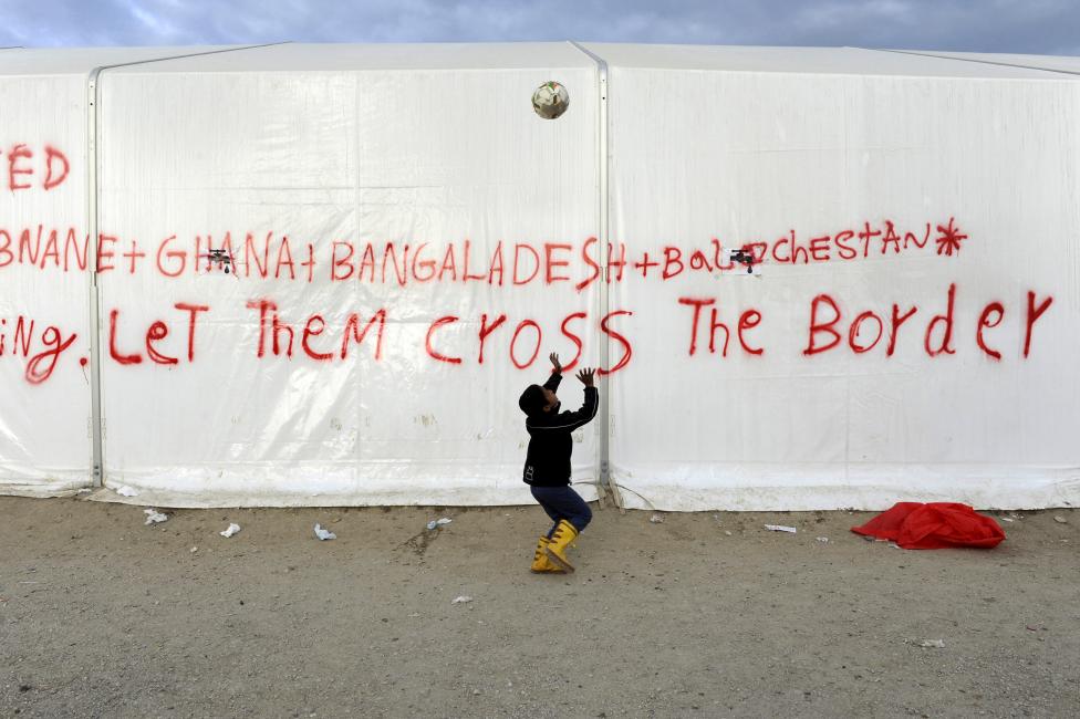3- طفل صغير يلعب بالكرة في انتظار السماح لهم بعبور الحدود المقدونية.