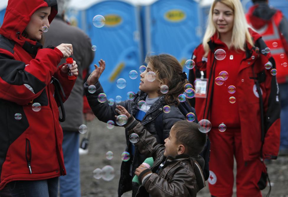 6- متطوعون يحاولون رسم البسمة على وجوه الأطفال، ويلعبون معهم بفقاعات المياه، قبل مواصلة رحلة القطار إلى أوروبا الغربية في مخيم مؤقت للاجئين في سلافونسكي برود على الحدود الكرواتية.