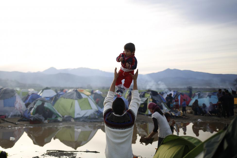 7- أب يلاعب طفله في مخيم غمرته المياه، في انتظار عبور الحدود اليونانية-المقدونية.