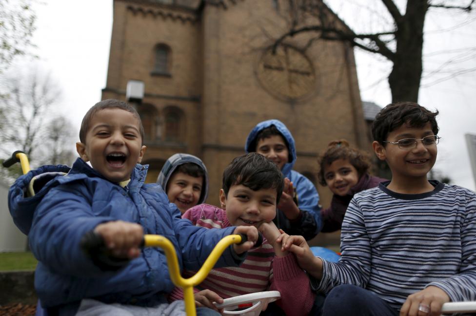 10- بعض أطفال المهاجرين من سوريا يمرحون أمام كنيسة بروتستانتية في أوبرهاوزن بألمانيا.