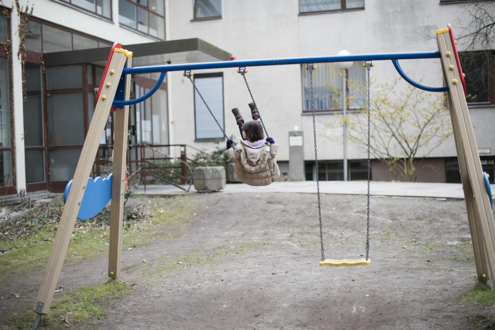 11- طفلة تلعب على أرجوحة خارج ملجأ للاجئين، في برلين، ألمانيا.