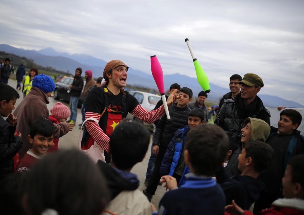12- قسوة الحياة في المخيمات، يجب أن يقطعها القليل من المرح، فيتطوع البعض لإدخال البسمة على الأطفال، فهنا مهرج يسلي المهاجرين في مخيم مؤقت على الحدود اليونانية-المقدونية.