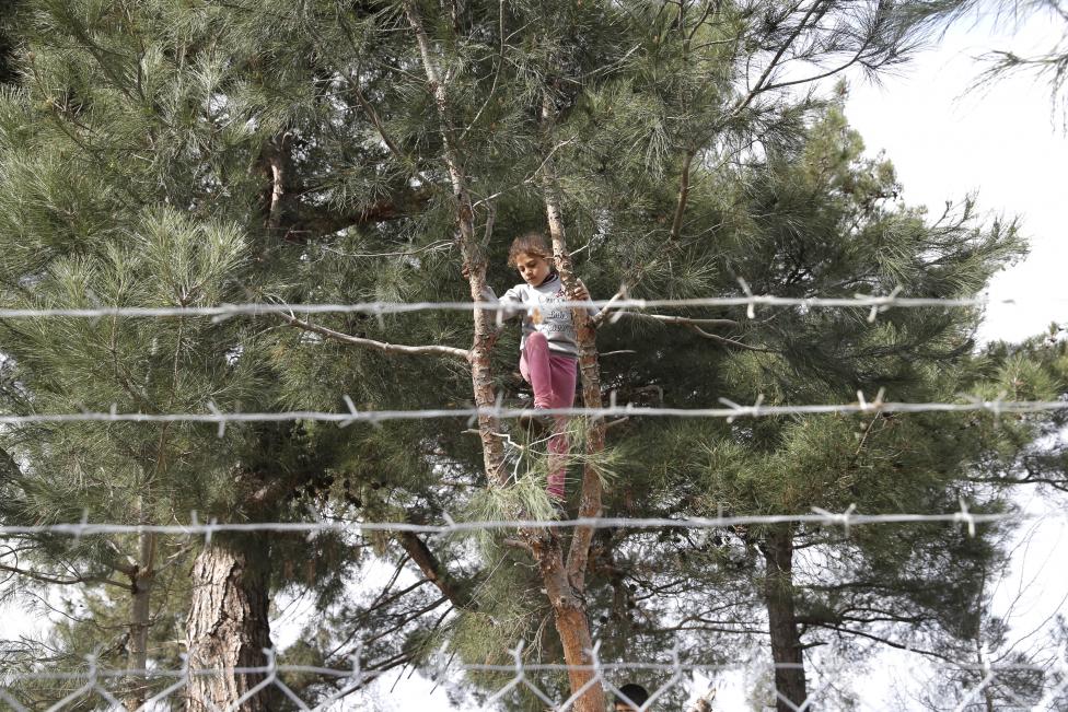 13- الأطفال تتعامل مع الطبيعة بلا خوف، فلن يروا أكثر مما رأوه في بلدهم، فتجد فتاة صغيرة تتسلق شجرة في مخيم المهاجرين بالقرب من السياج الحدودي اليوناني-المقدونية.