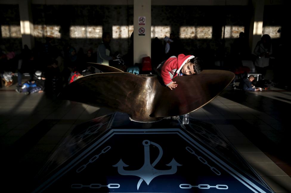 14- طفل وجد الراحة على تمثال المروحة داخل المحطة، بعد وصولهم على متن بلو ستار سفينة الركاب، من جزر ليسبوس وخيوس في ميناء بيرايوس، في أثينا، اليونان.