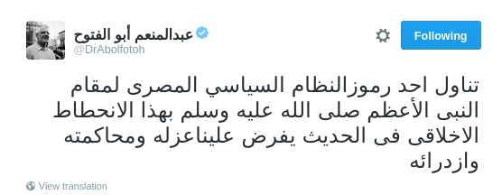 وقال -في تغريدة له على “تويتر”-: “تناول أحد رموز النظام السياسي المصري لمقام النبي الأعظم، صلى الله عليه وسلم، بهذا الانحطاط الأخلاقي في الحديث يفرض علينا عزله ومحاكمته وازدراءه”.