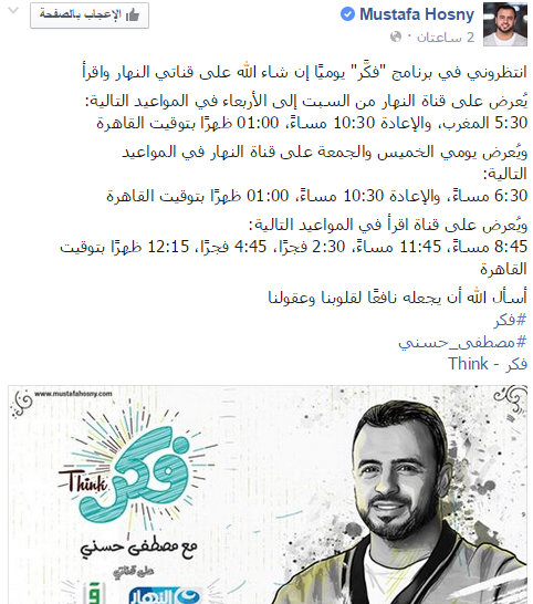 بينما كان مصطفي حسني ينظم مسابقة في الثقافة العامة ويوجه أسئلة إلى متابعيه، ويذكرهم بمواعيد برنامجه على فضائية “اقرأ”، ولم يوجه أي اعتناء لتصريحات “الزند” الأخيرة.