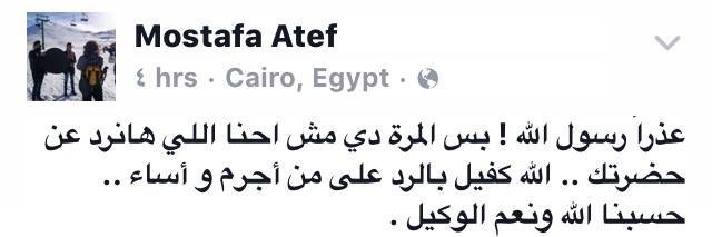 أما مصطفى عاطف فاكتفى بقوله: “عذرًا رسول الله! بس المرة دي مش احنا اللي هانرد عن حضرتك…”.