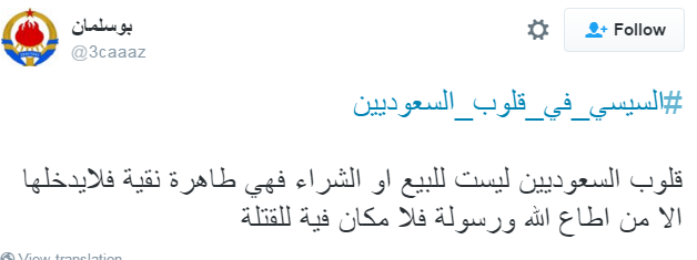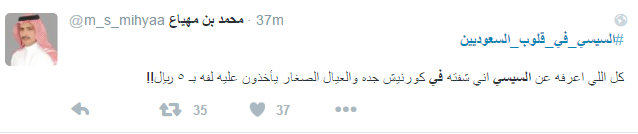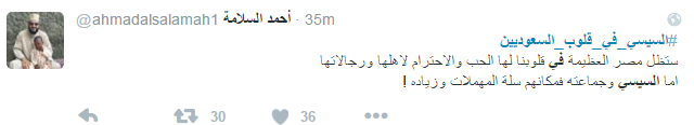 استخدم العديد من مغردي موقع التدوين المصغر "تويتر" هاشتاج "السيسي في قلوب السعوديين" للهجوم على السيسي، إذ تحول الهاشتاج الذي دشنه البعض في السابق لمدح السيسي إلى وسيلة لإدانة السيسي والسخرية منه