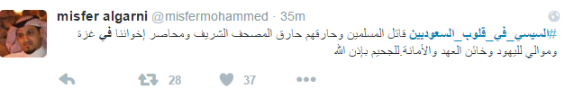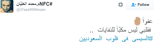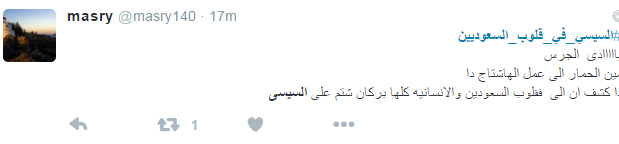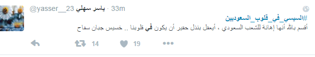 استخدم العديد من مغردي موقع التدوين المصغر “تويتر” هاشتاج “السيسي في قلوب السعوديين” للهجوم على السيسي، إذ تحول الهاشتاج الذي دشنه البعض في السابق لمدح السيسي إلى وسيلة لإدانة السيسي والسخرية منه.