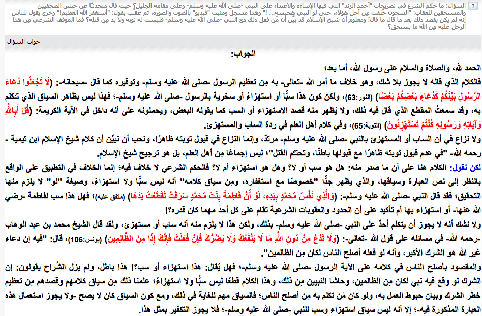 وأضاف “برهامي”، “لا نزاع في أن الساب أو المستهزئ بالنبي صلى الله عليه وسلم مرتدٌ، وإنما النزاع في قبول توبته ظاهرًا، ونحب أن نبيِّن أن كلام شيخ الإسلام ابن تيمية في عدم قبول توبته ظاهرًا مع قبولها باطنًا، وتحتـُّم القتل؛ ليس إجماعًا مِن أهل العلم، بل هو ترجيح شيخ الإسلام.. لا نشك أنه لا يجوز أن يتكلم أحدٌ على النبي صلى الله عليه وسلم بذلك، ولكن هذا لا يلزم منه أنه ساب أو مستهزئ”.