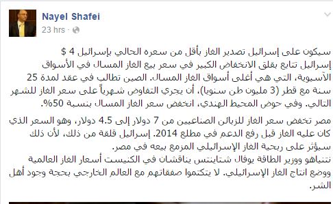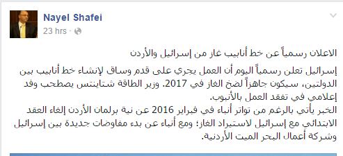 أكد مؤسس انسكلوبيديا "المعرفة" الرقمية، وخبير الاتصالات المصري الدكتور نايل الشافعي، أن "إسرائيل" أعلنت رسميًا، أمس الأحد، أن العمل يجري على قدم وساق لإنشاء خط أنابيب بين الدولتين، وأنه سيكون جاهزًا لضخ الغاز في 2017،