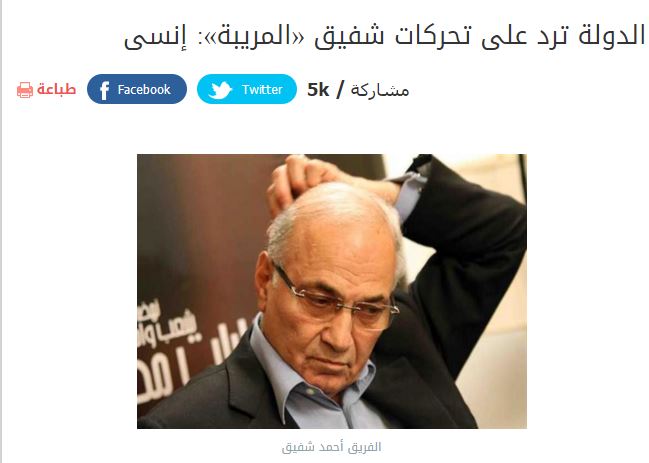 وبحسب المصدر نفسه الذي اعتمدت عليه “الشروق”، فإن هذه الرسالة جاءت بعد “رصد تحركات لشفيق، تهدف إلى زعزعة شرعية الرئيس المنتخب عبدالفتاح السيسي”- بحسب وصف الصحيفة، موضحًا “أن المرشح الرئاسي السابق يتواصل مع شخصيات في جهات مهمة ما زالت باقية على دعمه، وما زالت تأمل في أن يكون له دور في الحياة السياسية”.