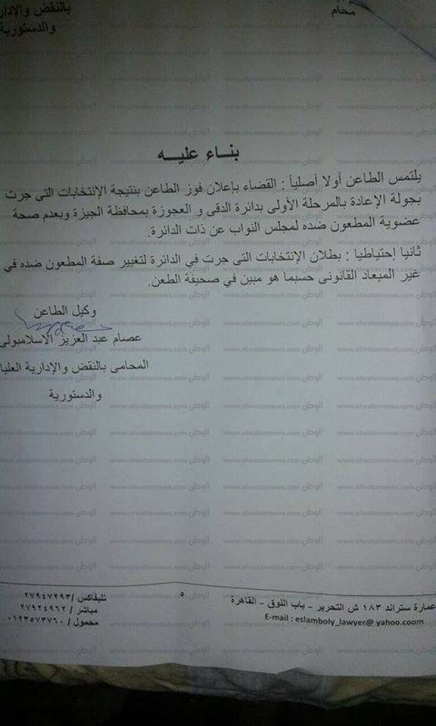 وأكد الإسلامبولي في مذكرته أن محكمة النقض، أعادت فرز أصوات دائرة الدقي والعجوزة، بحضور ممثلي الطرفين، وتبين تقدم الشوبكي في الأصوات عن أحمد مرتضى.