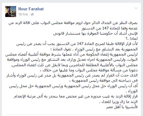 أكد الفقيه الدستوري، نور فرحات، أن وزير العدل المُقال، المستشار أحمد الزند، ما زال يشغل منصب وزير العدل وفقًا للدستور، وذلك من خلال تعليق نشره عبر حسابه الشخصي بموقع التواصل الاجتماعي “فيس بوك”.