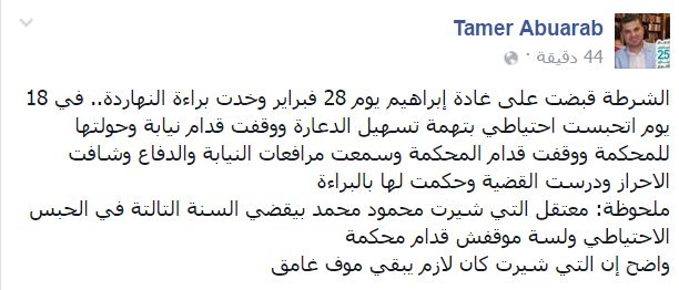 أعرب الكاتب تامر أبو عرب، عن دهشته من الإفراج عن الفنانة غادة إبراهيم، بعد 18 يومًا فقط من القبض عليها، بينما “معتقل التيشرت” يقضي السنة الثالثة في الحبس الاحتياطي ولم تحدد له جلسة واحدة.