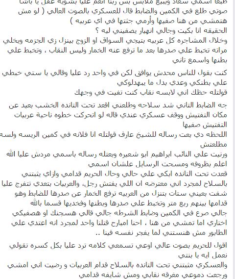 وسبق وأن كتبت الصحفية، عن الطريقة التي يتعرض خلالها نساء سيناء للتفتيش، أثناء مرورهن من كمين الريسة؛ إذ يدعو الضابط المرأة للنزول ورفع نقابها والطرق على صدرها وبطنها، وطالبت كل من يرى ذلك أن يوثقه ويكشف الحقيقة.