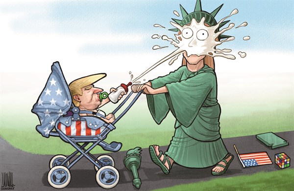 فنشر موقع “بولتيكال كارتونز” هذا الرسم الساخر من المرشح الأميركي دونالد ترامب:
