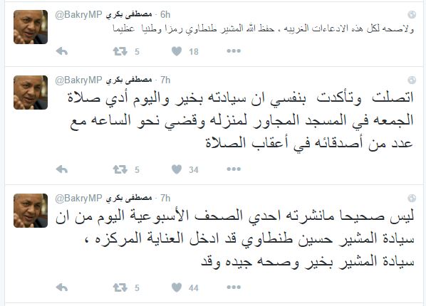 وأكد بكري -في تغريداته- أنه اتصل بالمشير طنطاوي بنفسه، وتأكد من حالته الصحية، مشددًا على عدم دخولة العناية المركزة، وأنه أدى صلاة الجمعة اليوم بأحد المساجد القريبة من منزله.