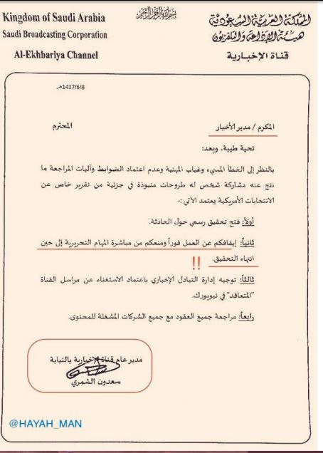 كانت قناة “الإخبارية” السعودية، التابعة رسميًا للحكومة، قد اعتذرت -عبر حسابها في موقع التواصل الاجتماعي “تويتر”، أول أمس الخميس- عن ظهور الكاتب الأردني، نصير العمري، المعروف بانتقاده اللاذع للسعودية، على حد قولها، كما تم إيقاف مراسلها المتعاقد في نيويورك، ومراجعة جميع العقود مع الشركات المشغلة للمحتوى.