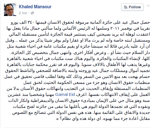 واختتم: “أعرف جمال عيد مهنيًا وشخصيًا منذ عشرين سنة، وهو مثال حي على الإيمان بمبادئ حقوق الإنسان والديمقراطية وإنكار الذات، ونقوده التي قد تجمدها الدولة اليوم هي في أغلبها ما تبقى من جائزته لفتح مكتبات جديدة والإنفاق على القائمة منها.. هذه هي نفس الدولة التي تتصالح مع اللصوص مقابل إعادة جزء مما نهبوه. أي دولة هذه وأي نظام؟”.