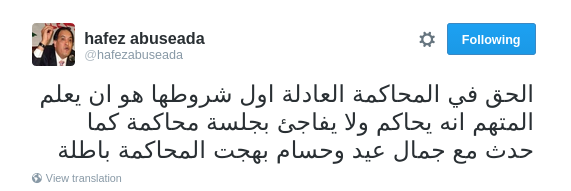 وكتب “أبو سعدة” -عبر “تويتر”-: “الحق في المحاكمة العادلة أول شروطها هو أن يعلم المتهم أنه يحاكم”.