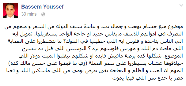 أما المذيع الساخر باسم يوسف، فقال: “موضوع منع حسام بهجت وجمال عيد وعايدة سيف الدولة من السفر، ومنعهم من التصرف في أموالهم، للأسف مابقاش جديد أو حاجة الواحد يستغربها”.