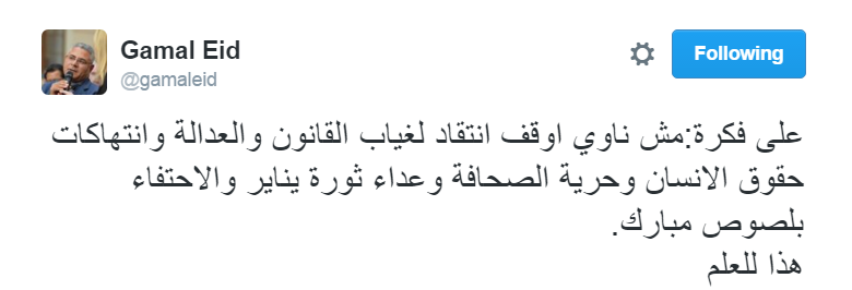 يقول جمال عيد، مدير الشبكة العربية لمعلومات حقوق الإنسان -عبر “تويتر”-: “على فكرة مش ناوي أوقف انتقاد لغياب القانون والعدالة وانتهاكات حقوق الإنسان وحرية الصحافة وعداء ثورة يناير والاحتفاء بلصوص مبارك، هذا للعلم”.