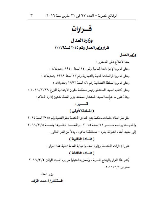 وتضمنت المادة الثانية، المنشورة عبر الجريدة الرسمية، الإدارات المختصة بوزارة العدل والنيابة العامة لتنفيذ هذا القرار، وفي المادة الثالثة جاء أن ينشر هذا القرار بالوقائع المصرية ويعمل به اعتبارًا من يوم السبت الموافق 5/3/2016.