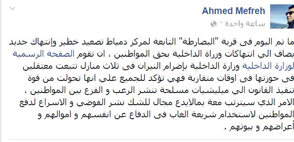 اعتبر الناشط الحقوقي أحمد مفرح أن ما تم اليوم في قرية "البصارطة" التابعة لمركز دمياط، من حرق الشرطة لمنازل معارضي حكم العسكر "تصعيد خطير وانتهاك جديد يضاف إلى انتهاكات وزارة الداخلية بحق المواطنين".