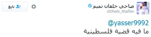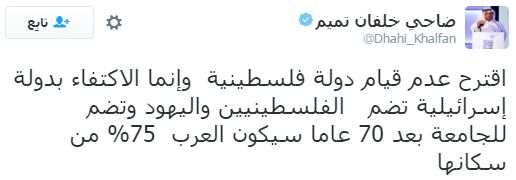 وقال خلفان في عدة تغريدات أخرى، إن “إسرائيل لا تشكل خطرًا على العرب، والخطر الحقيقي يأتي من الإخوان المسلمين”، وفي معرض إجابته عن سؤال أحد متابعيه: “هل الفلسطينيون ليسوا عربًا حتى لا تكون إسرائيل خطرًا عليهم حسب إجابتك الكريمة”، أجاب خلفان: “إسرائيل ليست خطرًا على العرب”، وفي تغريدة أخرى قال: “ما في قضية فلسطينية”.