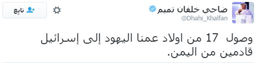 سلسلة التغريدات الغريبة والمفاجئة هذه جاءت من قِبل خلفان كتعليق على وصول 17 يهوديًا من اليمن أحضرتهم “إسرائيل” في عملية سرية تم الكشف عنها اليوم الاثنين.