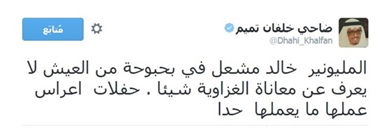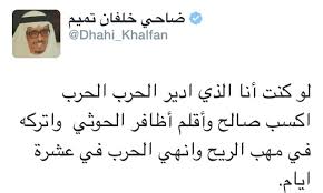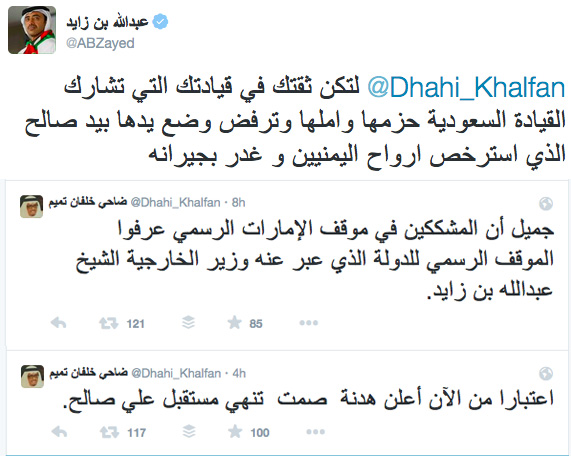 وفي 11 مايو 2015، شهد موقع “تويتر” سجالًا يكاد يكون غير مسبوق، بين القيادي الأمني في إمارة دبي الفريق ضاحي خلفان، ووزير خارجية الإمارات الشيخ عبدالله بن زايد، حول حرب اليمن التي تشارك فيها الإمارات ضمن التحالف بقيادة السعودية.