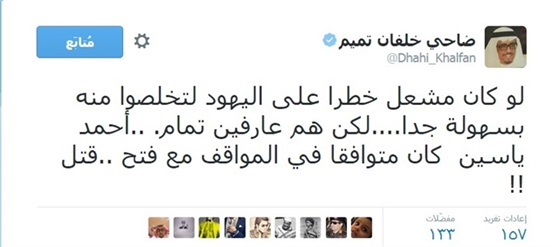 وقال خلفان في سلسلة من التغريدات نشرها على حسابه الشخصي على موقع التواصل “تويتر” إنه “بوجود خالد مشعل، تضمن إسرائيل عندم التوافق الفلسطيني- الفلسطيني”، وأنه لو كان يشكل خطرًا على إسرائيل لقامت بالتخلص منه بسهولة، وأردف قائلاً: “لكن هم عارفين تمام.. أحمد ياسين كان متوافق في المواقف مع فتح.. قتل!!”.