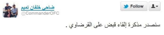 وهدد خلفان بإصدار مذكرة اعتقال بحق يوسف القرضاوي، في حال تحدثه عن الإمارات، مثل ما فعله بإغلاق مكتب صهره، حسب قوله.