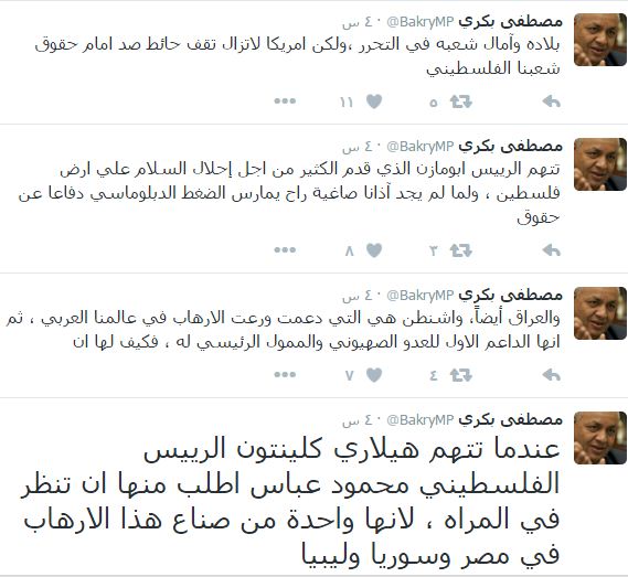 وقال -عبر عدة تغريدات له على “تويتر”-: “عندما تتهم هيلاري كلينتون الرئيس الفلسطيني محمود عباس، اطلب منها أن تنظر في المرآة؛ لأنها واحدة من صناع هذا الإرهاب في مصر وسوريا وليبيا”.
