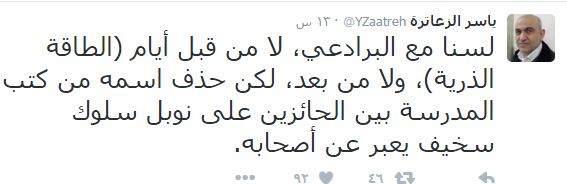 واعتبر المحلل الفلسطيني ياسر الزعاترة أن حذف اسم البرادعي “سلوك سخيف يعبر عن أصحابه”، حيث قال -عبر تغريدة له على “تويتر”-: “لسنا مع البرادعي، لا من قبل أيام (الطاقة الذرية)، ولا من بعد، لكن حذف اسمه من كتب المدرسة بين الحائزين على نوبل سلوك سخيف يعبر عن أصحابه”.