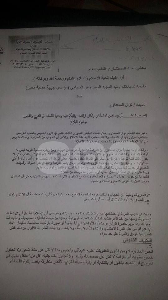 تقدم المحامي عبدالمجيد السيد جابر، مؤسس “جبهة حماية مصر”، ببلاغ إلى النائب العام؛ يتهم فيه نوال السعداوي بازدراء الدين الإسلامي والتهكم عليه.