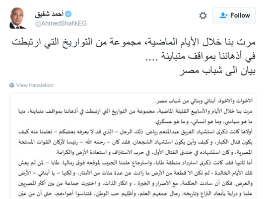آخر رسائل شفيق كانت بمناسبة “عيد الأم”، موجها التحية لأمهات الجنود الذين قُتلوا في سيناء، كما دعا الشباب لشحذ الهمم للنهوض بمستقبل مصر.
