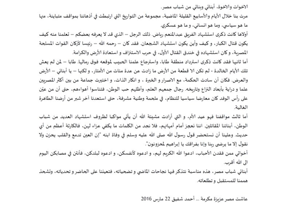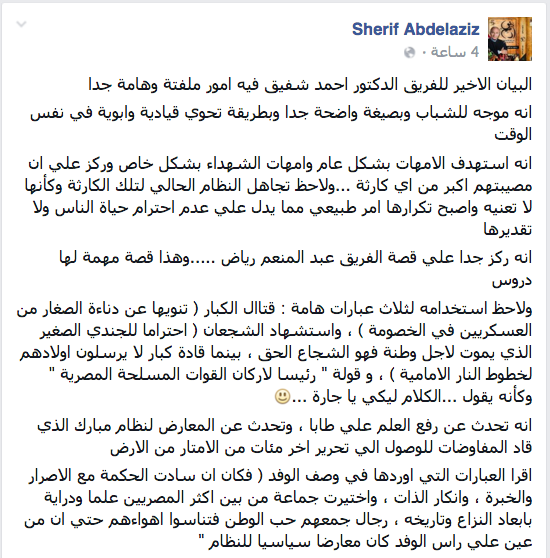 أولى رسائل شفيق كانت تذكيره شباب مصر بالفريق عبد المنعم رياض، الذي صادفت ذكرى مقتله الـ47، قبل أسبوعين؛ حيث قال: “تعلّمنا منه كيف يكون قتال الكبار، وكيف وأين يكون استشهاد الشجعان”؛ حيث كان رياض رئيس أركان حرب القوات المسلحة المصرية، في معركة الاستنزاف، وتدمير خط بارليف عام 1969.
