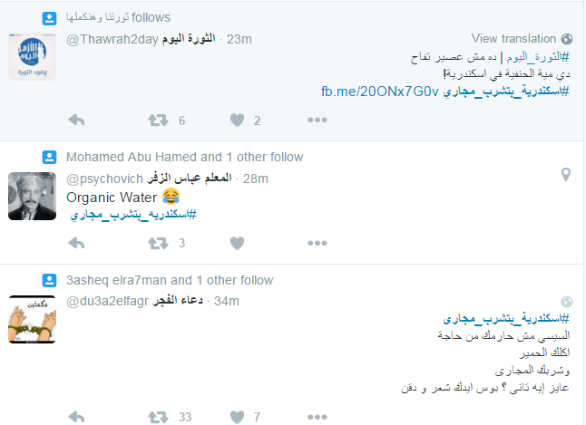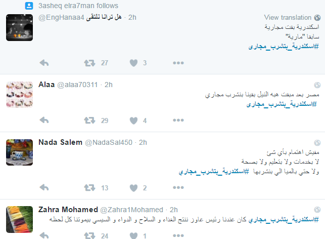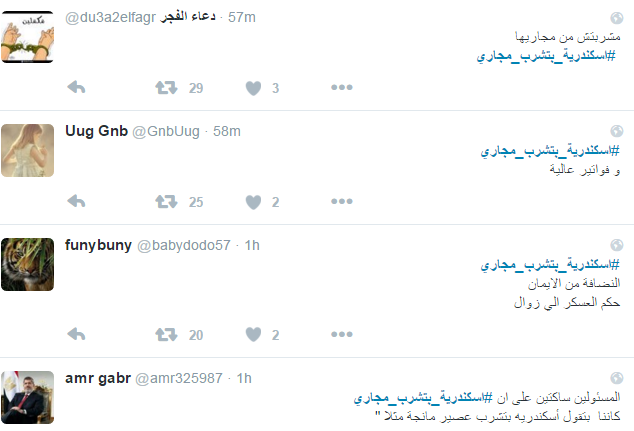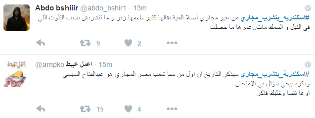 ونشروا صورًا أثارت استياءهم لتلوث مياه الشرب واختلاطها بمياه الصرف الصحي بعدد كبير من المناطق داخل محافظة الإسكندرية، واحتل هذا الهاشتاج الصدارة والأكثر تداولاً على مستوى مصر عبر موقع “تويتر”.
