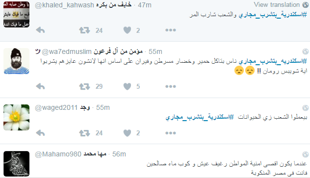 تصدر هاشتاج "إسكندرية بتشرب مجاري" موقع التدوين المصغر "تويتر"، حيث عبر فيه المغردون من أهالي الإسكندرية عن مآساتهم ومعاناتهم من سوء الخدمات والتي منها مياه الشرب